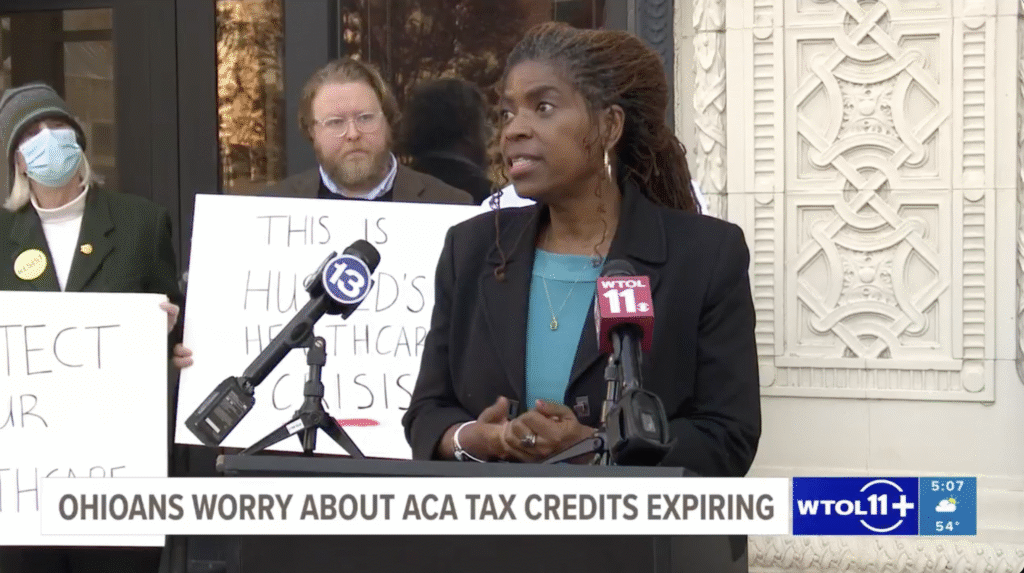 | Tim Miller: With open enrollment now underway, an estimated 583,000 Ohioans are bracing for record premium hikes as federal ACA tax credits expire at the end of the year. Tim Miller: Advocates for the Affordable Health Care Act held a news conference today outside of Senator Jon Husted’s Toledo office. They say he is refusing to act as costs surge and coverage remains at risk. Tracii Johnson, Toledo native: “The ACA tax credit allows for me to be able to afford my own health insurance, and I’m very concerned that Senator Husted has not been fighting for health care for Ohioans, and I’m very concerned that I am not going to be able to continue to serve my community.” Tim Miller: Now some say without action to extend the tax credits, many Ohioans could lose access to affordable health care. Columbus Dispatch: Ohio doctors warn of high health care costs as fight over Obamacare subsidies heats up Days into open enrollment for 2026, a group of physicians sounded the alarm about the potential loss of enhanced tax credits under the Affordable Care Act. “Ohioans will be sicker, poorer and less secure because of the attacks on health care,” Akron-area psychiatrist Doug Smith said during a news conference on Nov. 5. KFF projected that a lapse in enhanced tax credits could more than double what enrollees with subsidies pay right now. A single adult in Franklin County who earns $50,000 could see premiums increase by more than $1,700, according to a calculator provided by KFF. Costs could rise by $8,500 for a family of four in Summit County with a household income of $130,000. In Hamilton County, couples who make $90,000 may spend $4,600 more on health care. Toledo Blade: Toledoans express concerns over future of affordable health care amid government shutdown Ms. Johnson, the executive director of the Monroe Street Neighborhood Center, was able to get insurance under the Affordable Care Act, but if Congress doesn’t extend those tax credits, her premiums will triple. “It’s not cheap, and it’s not really good,” Ms. Johnson said of her insurance plan. But without it, she would have to forgo health-care coverage altogether. “[…] The alternative is just don’t have any health care and pray that I don’t have to go to the hospital.” Mr. Husted was not at his Toledo office on Thursday, but Dr. Ross asked the senator to come visit. “Come listen to us,” Dr. Ross said, “because people are going to suffer […].”WTVG: Husted’s Refusal to Extend Affordable Care Act Tax Credits |