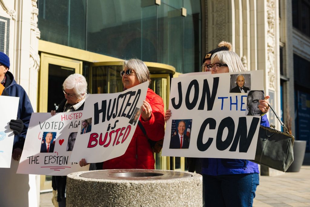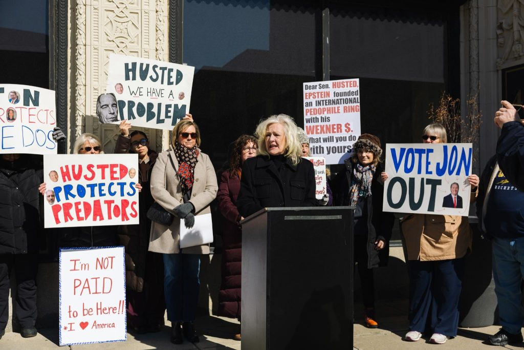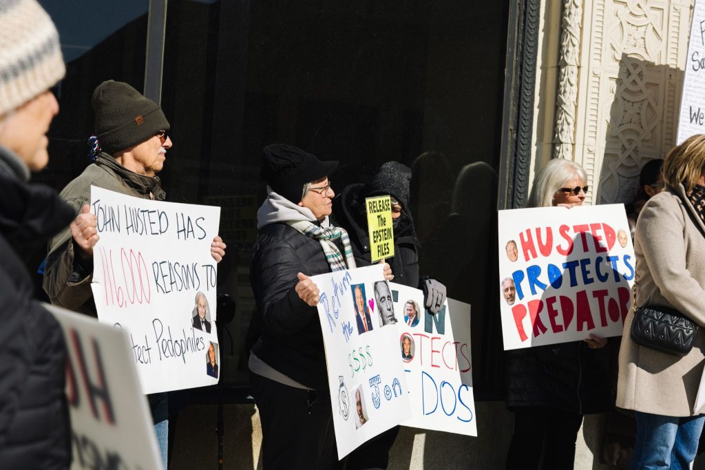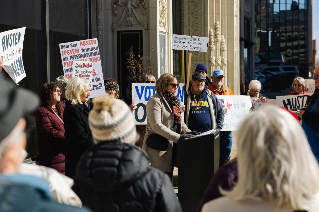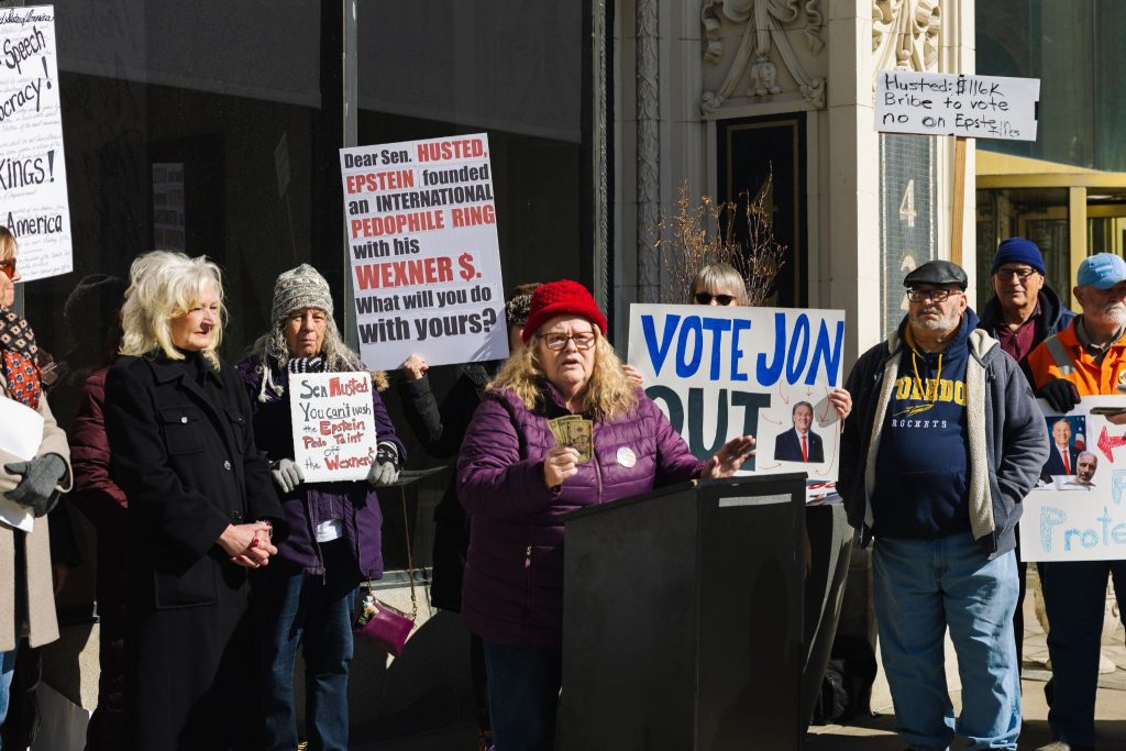 Toledo, Ohio — Today, Ohioans called out Senator Jon Husted outside his Toledo office for taking more than $116,000 directly from Epstein co-conspirator Les Wexner, including a maximum donation just a few weeks before he voted to block the release of the Epstein files.